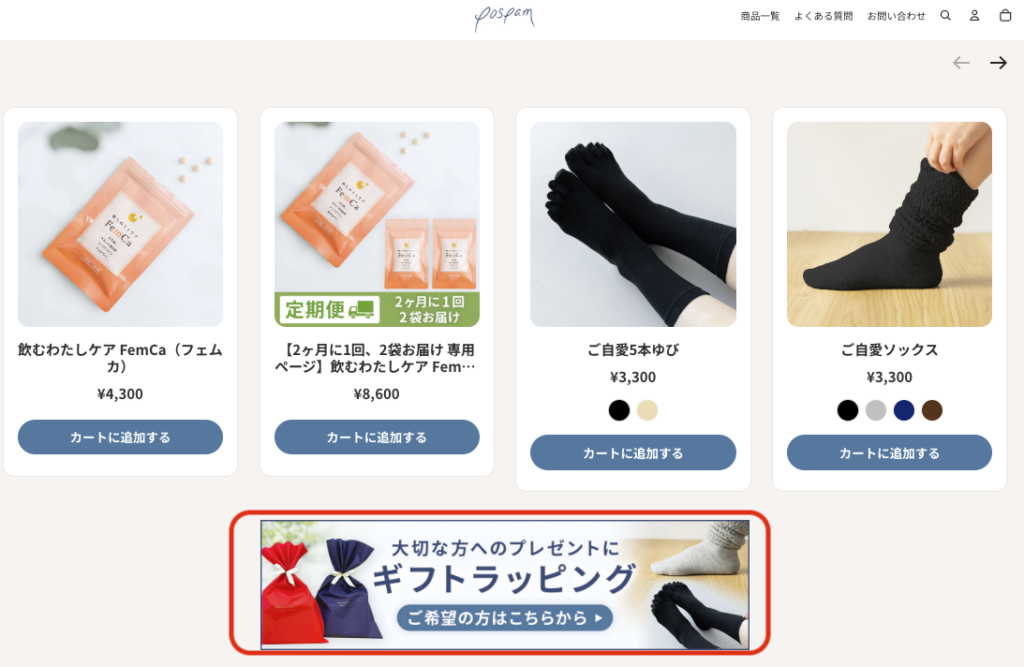 プレゼントしたい商品を、ギフトラッピング資材と一緒に商品をご購入いただくことでギフト対応が可能になります。トップページや商品ページのカート下をご確認ください。